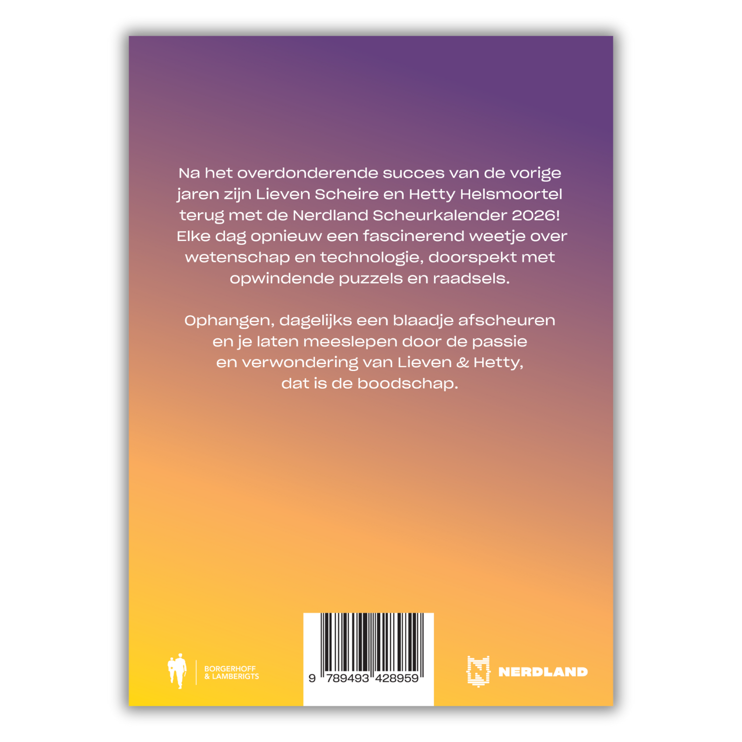 Na het overdonderende succes van de vorige jaren zijn Lieven Scheire en Hetty Helsmoortel terug met de Nerdland Scheurkalender 2026! Opnieuw elke dag een fascinerend weetje over wetenschap en technologie, doorspekt met opwindende puzzels en raadsels.
